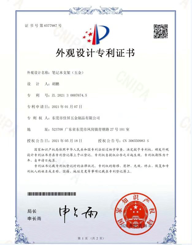 • 筆記本支架-五金專利證書